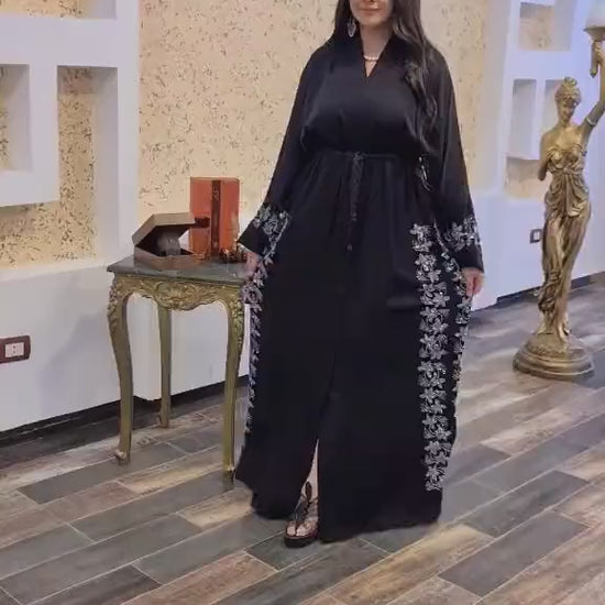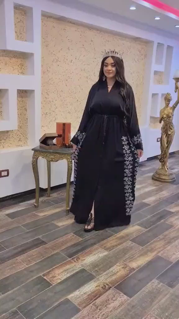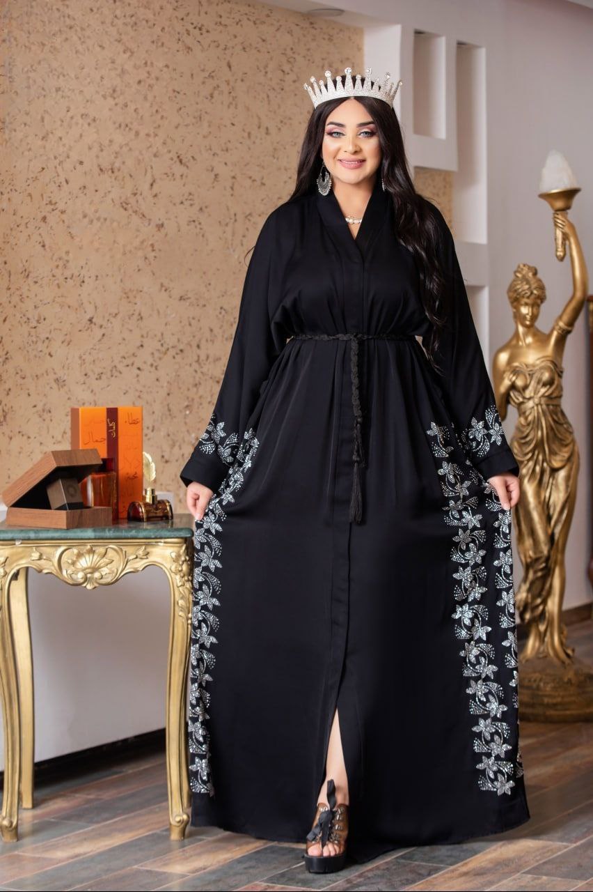 عباية ملكية باللون الأسود الراقي، مزينة بتطريز فضي فاخر على الأكمام والجوانب، مصممة لتمنحك حضوراً يليق بالملكات 👑
